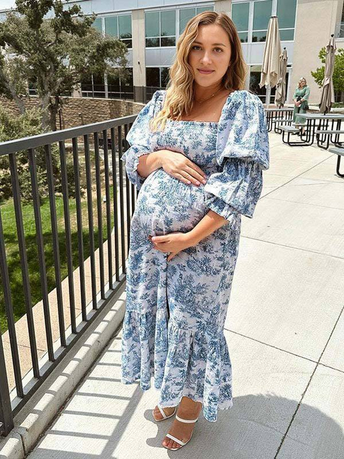 Momyknows Ruffle Ruched High Waist Puff Sleeve Cute Photoshoot Maternity Maxi Dress