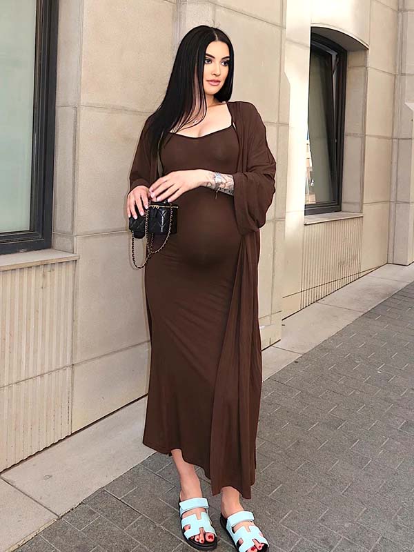 Momyknows Light Coffee Knit Tank Dress And Long Cardigan Two Piece Set Maternity Maxi Dress