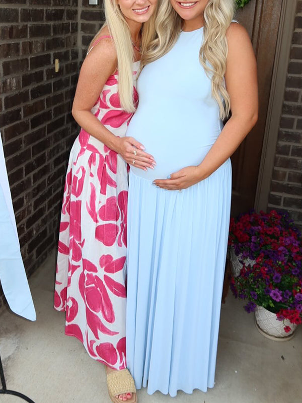 Momyknows Blue Ruched Ruffle Pockets Big Swing Sleeveless Maternity Maxi Dress