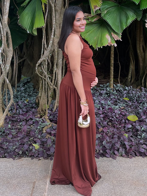 Momyknows Brown Halter Neck Backless Mermaid Maternity Maxi Dress