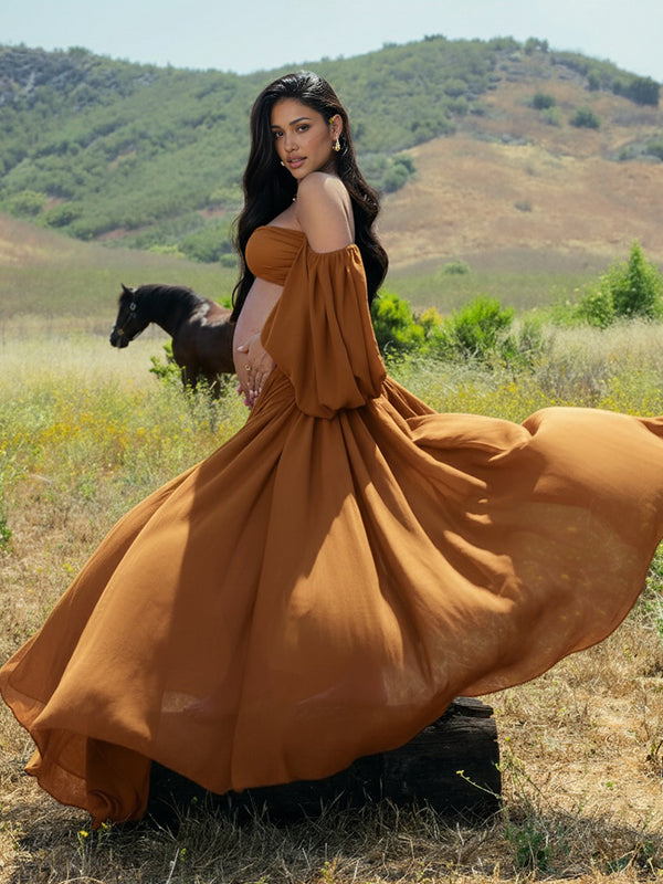 Momyknows Brown Off Shoulder Ruched Flare Sleeve Maternity Maxi Dress