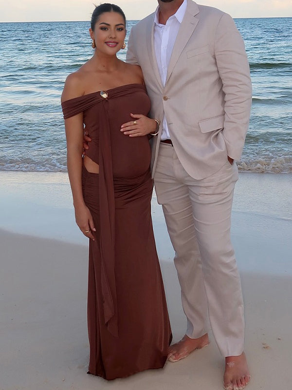 Momyknows Flowy Off Shoulder Ruched Metal Buckle Side Slit Two Piece Set Maternity Maxi Dress