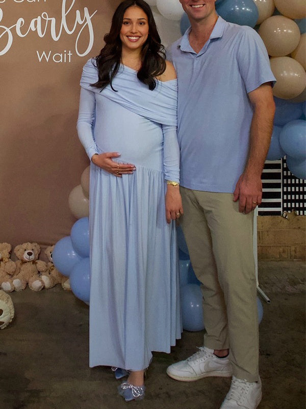 Momyknows Blue One Shoulder Ruched Draped Baby Boy Shower Maternity Maxi Dress