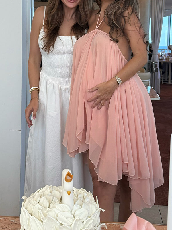 Momyknows Pink Mesh Irregular Ruffle Halter Neck Backless Cami Maternity Mini Dress