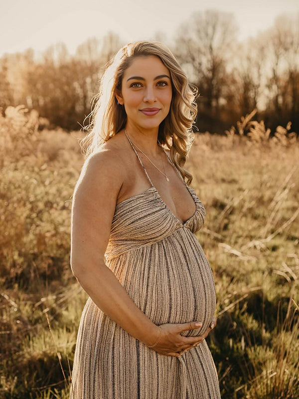 Momyknows Beige Halter Neck Lace-up Backless Maternity Photoshoot Maxi Dress