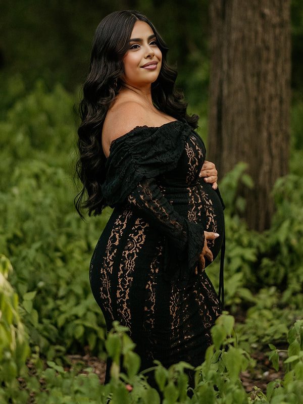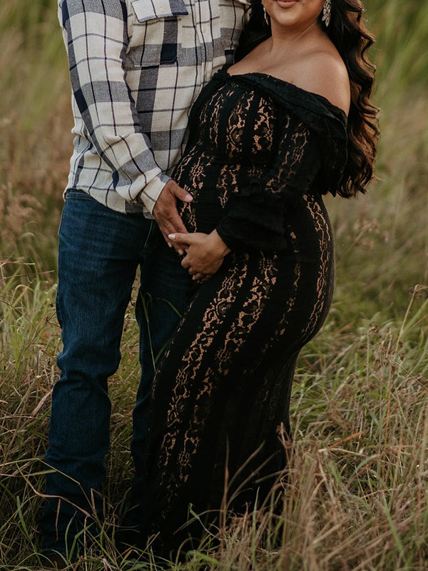 Momyknows Black Lace Off Shoulder Ruffle Falbala Mermaid Maternity Maxi Dress