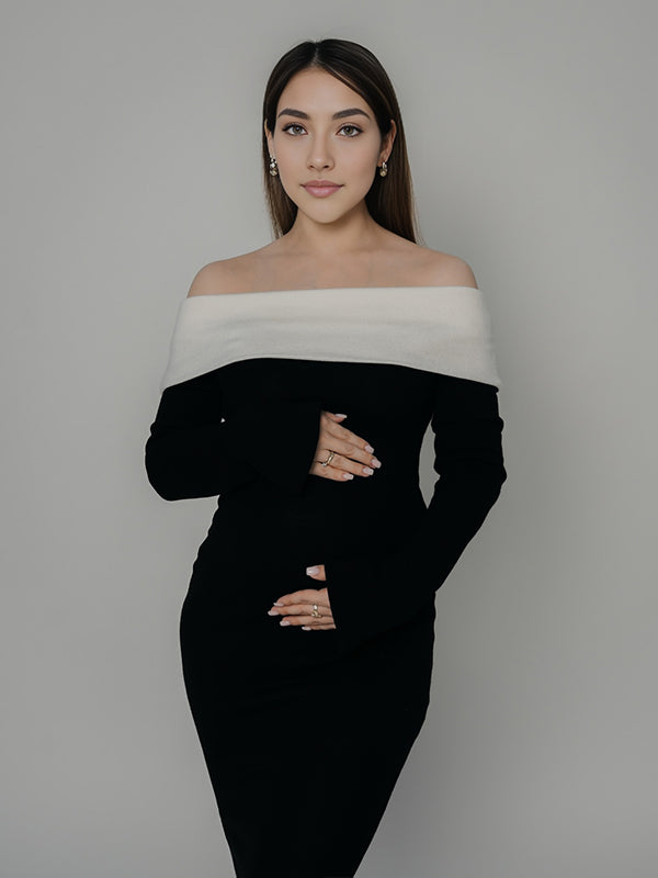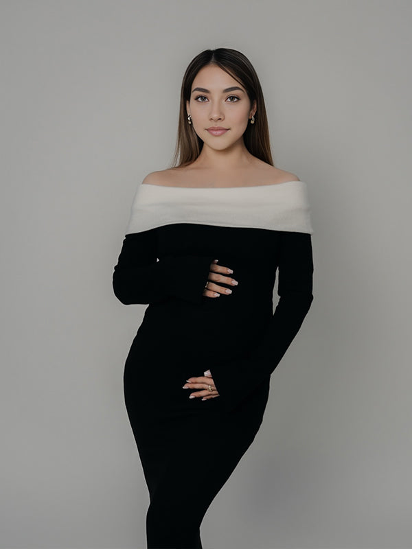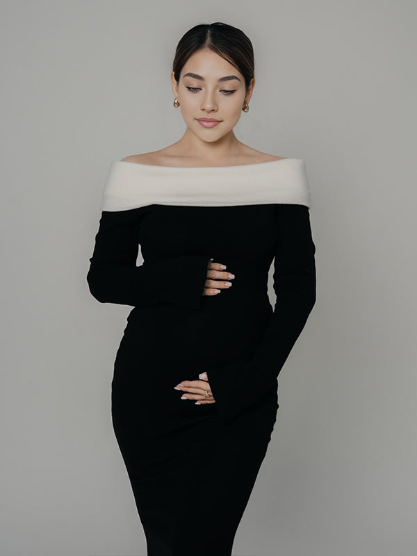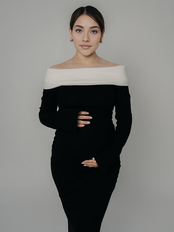 Momyknows Black Off Shoulder Hit Color Bodycon Maternity Photoshoot Maxi Dress