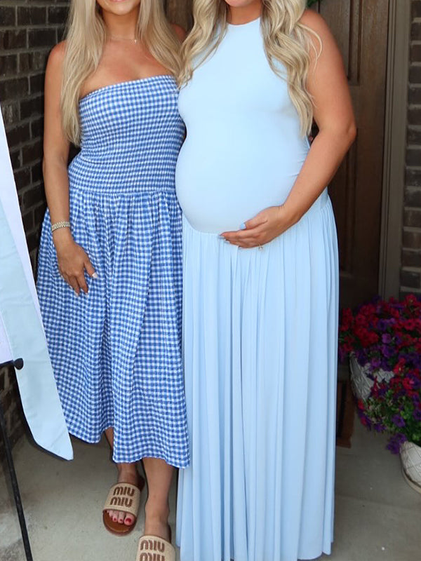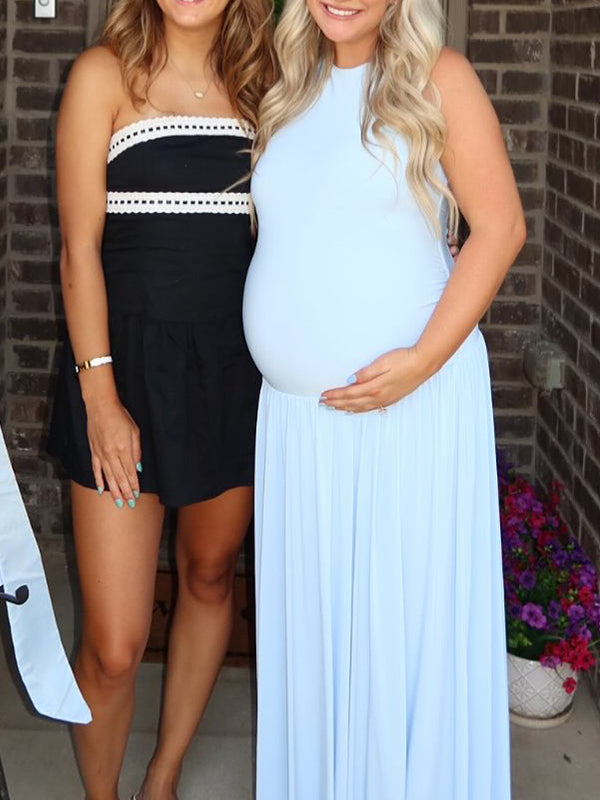 Momyknows Blue Ruched Ruffle Pockets Big Swing Sleeveless Maternity Maxi Dress