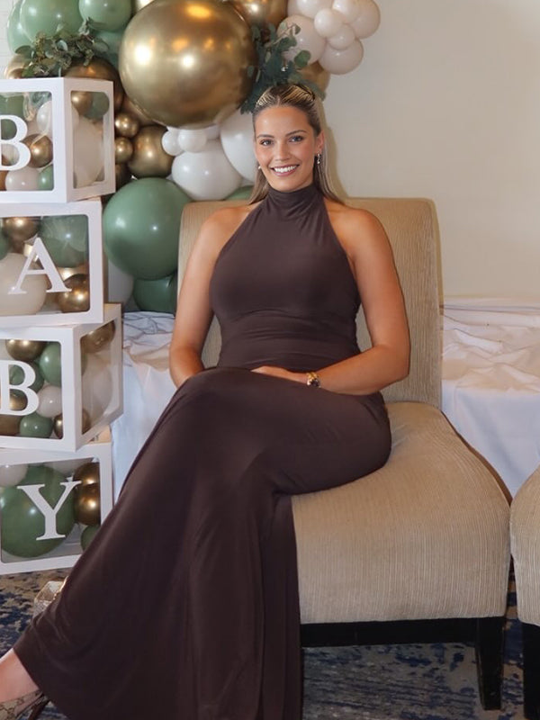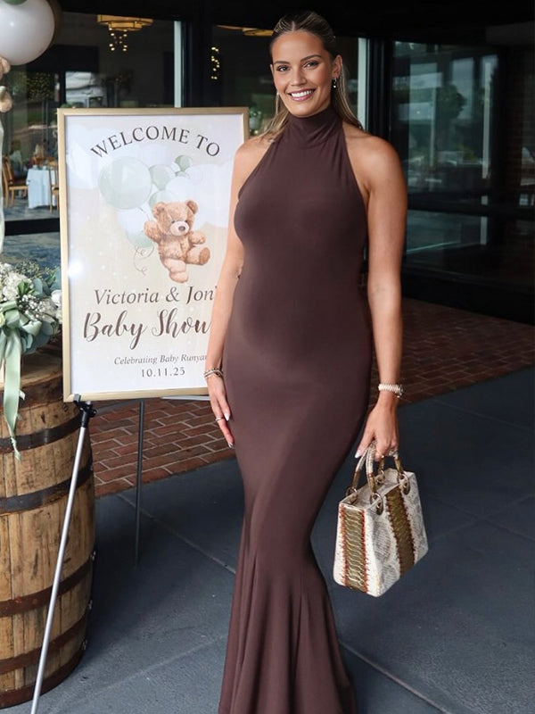 Momyknows Brown Halter Neck Backless Mermaid Maternity Maxi Dress