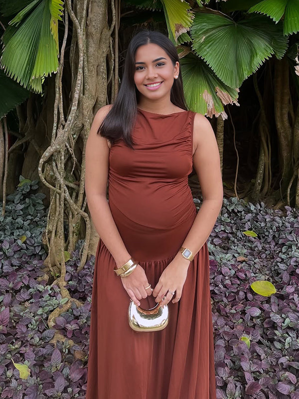 Momyknows Brown Ruched Ruffle Big Swing Sleeveless Maternity Maxi Dress