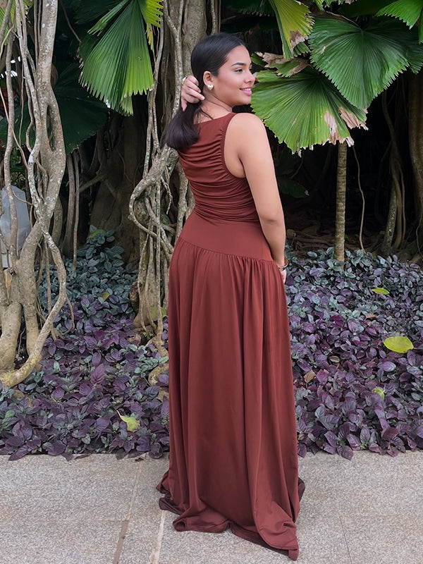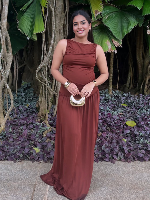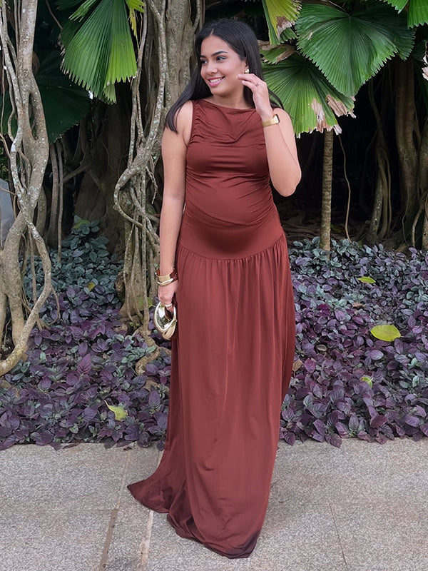 Momyknows Brown Ruched Ruffle Big Swing Sleeveless Maternity Maxi Dress