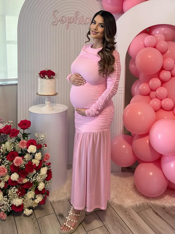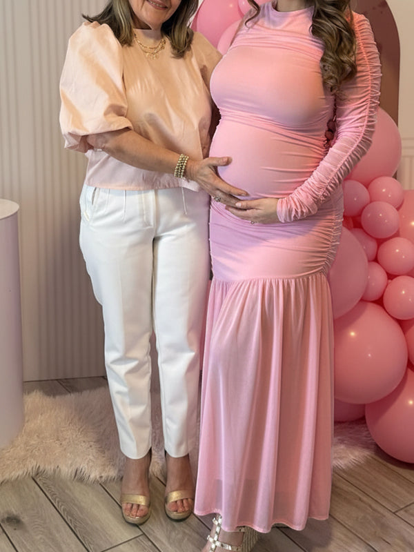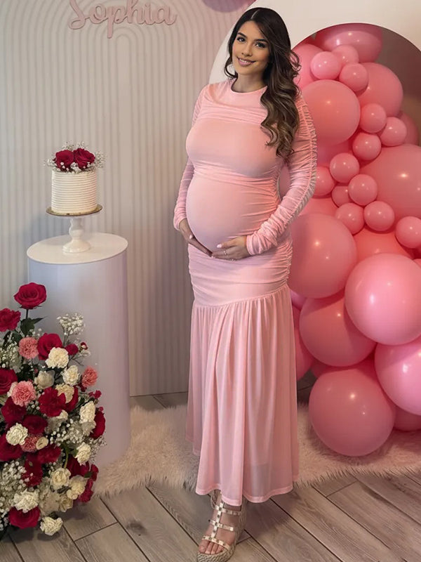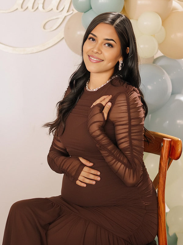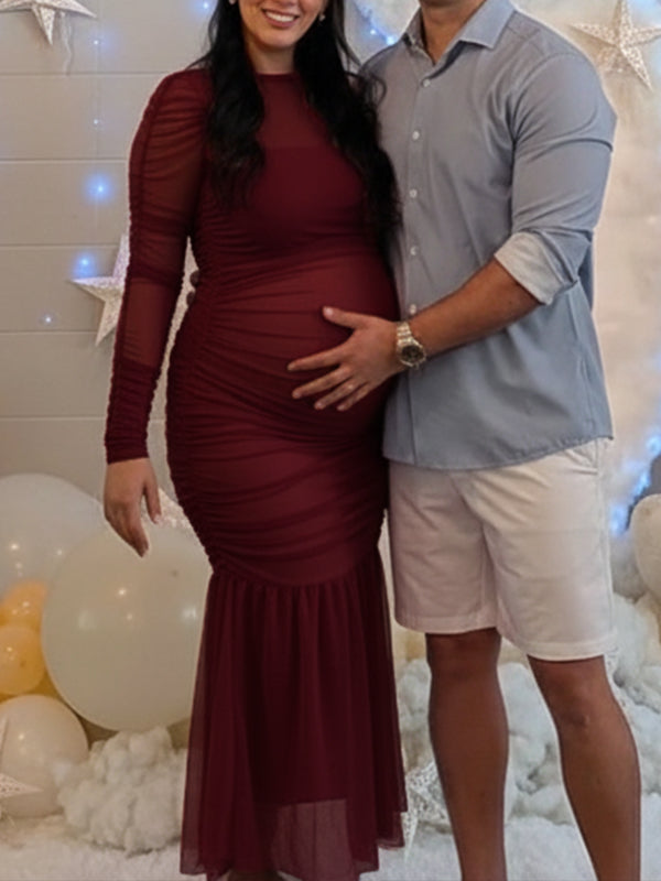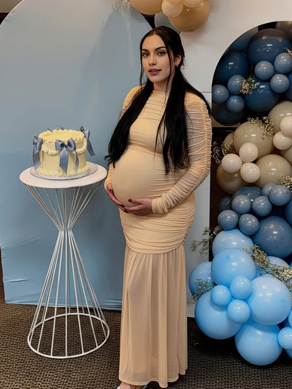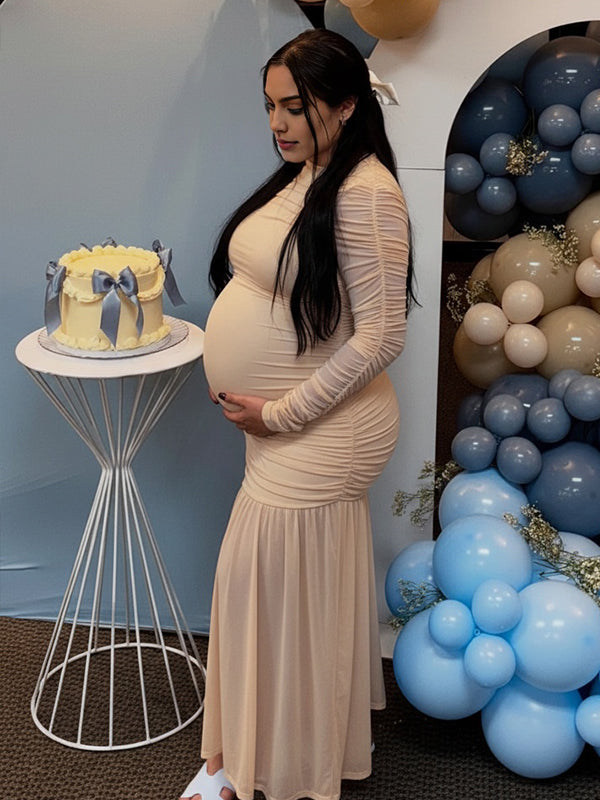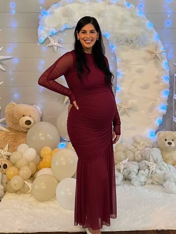 Momyknows Mesh Ruched Mermaid Sheer Maternity Maxi Dress