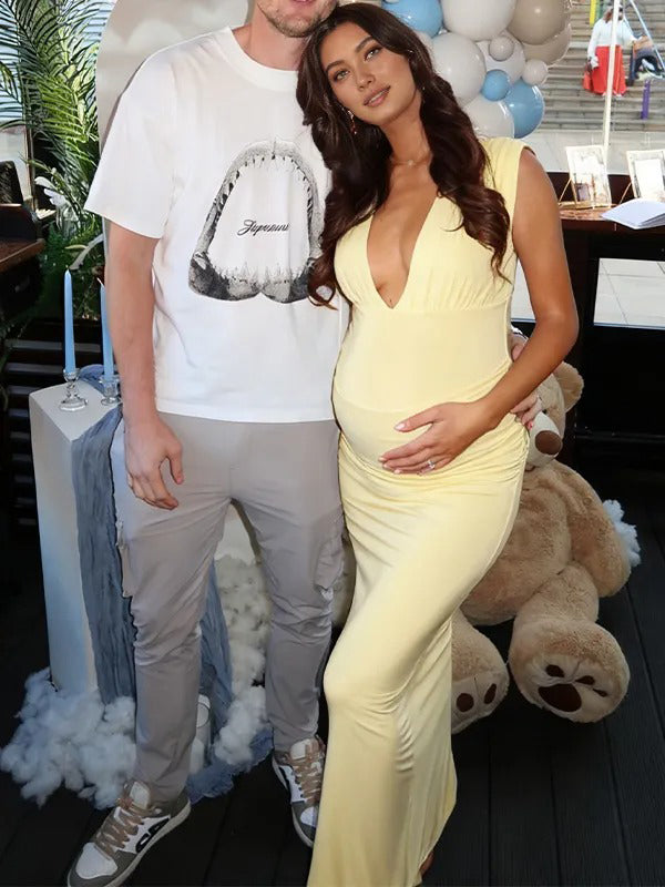 Momyknows Ruched Baby Shower Maternity Maxi Dress