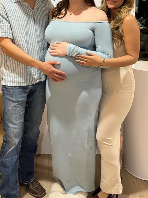 Momyknows Blue Off Shoulder Side Slit Maternity Photoshoot Maxi Dress