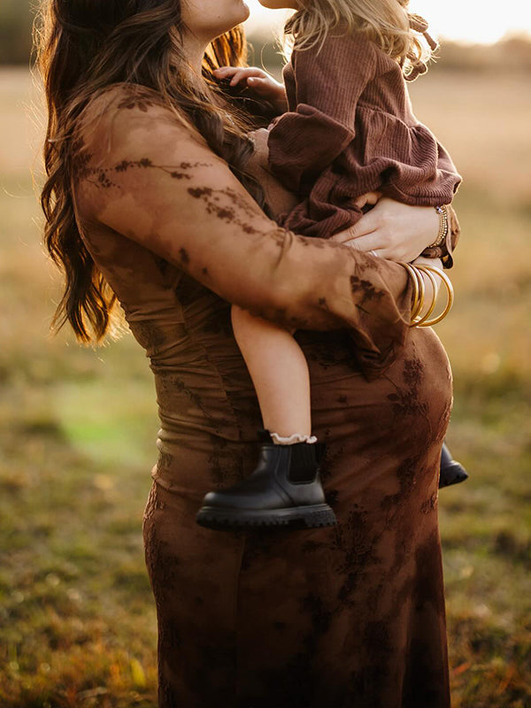 Momyknows Dark Brown Printed Mesh Ruffle Ruched Boho Maternity Maxi Dress