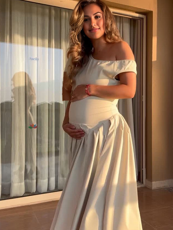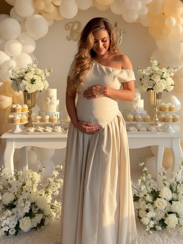Momyknows Khaki One Shoulder Irregular Pleated Big Swing Maternity Maxi Dress
