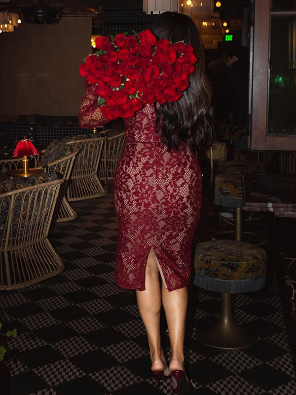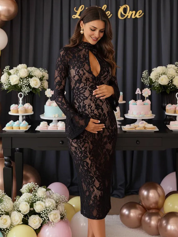 Momyknows Lace Cut Out Back Slit Flare Sleeve Bodycon Maternity Midi Dress