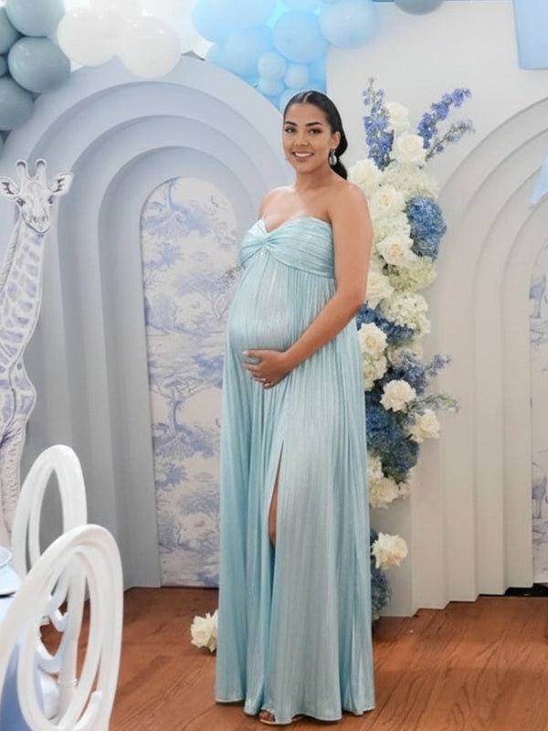Momyknows Metallic Color Pleated Bandeau Cross Chest Side Slit Big Swing Maternity Maxi Dress