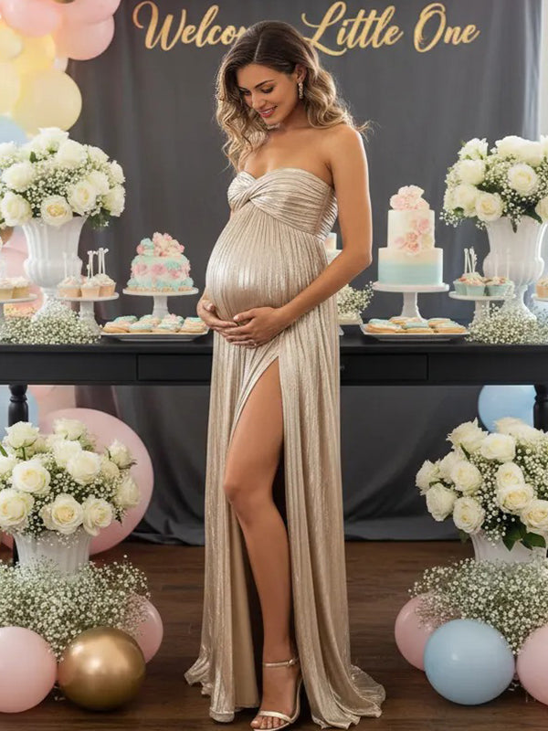 Momyknows Metallic Color Pleated Bandeau Cross Chest Side Slit Big Swing Maternity Maxi Dress