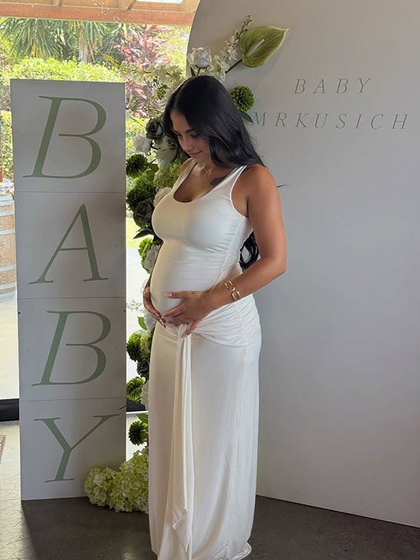 Momyknows White Ruched Crop Top Maternity Photoshoot Maxi Dress