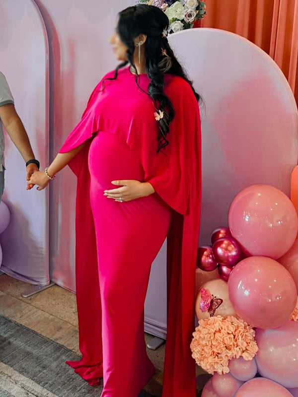 Momyknows Rose Carmine Cape Grenadine Maternity Baby Shower Maxi Dress