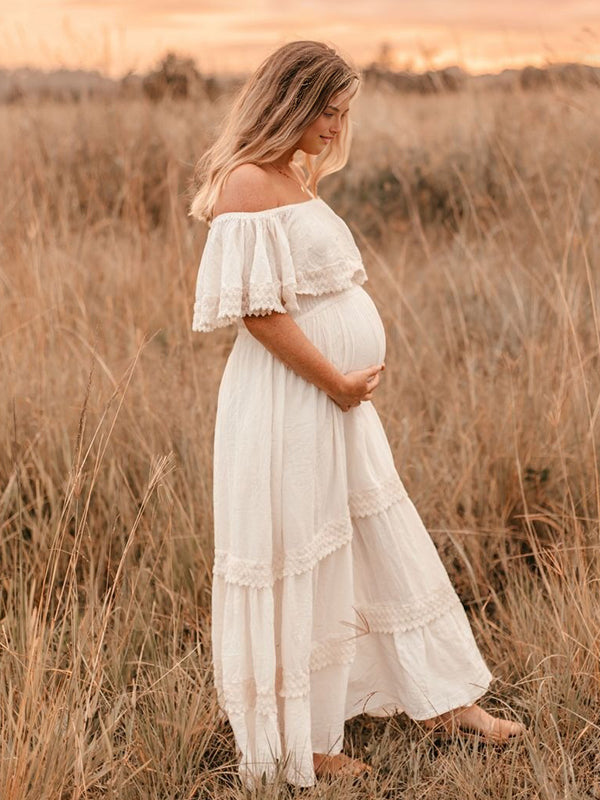 Momyknows Ivory White Off Shoulder Lace Ruffle Big Swing Boho Maternity Maxi Dress