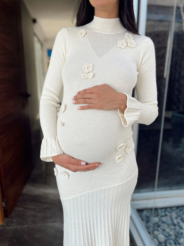 Momyknows White Knit 3D Flowers Pleated Mermaid Maternity Sweater Maxi Dress