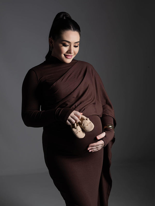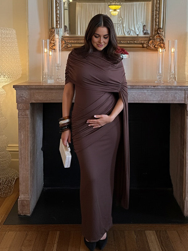 Momyknows Brown Irregular Ruched Draped Cape Sleeve Bodycon Maternity Maxi Dress
