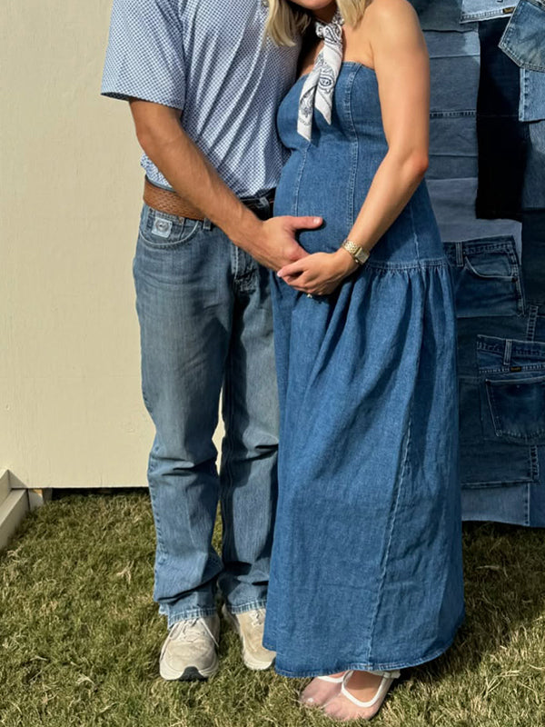 Momyknows Denim Blue Bandeau Bodice Strapless Big Swing Maternity Maxi Dress