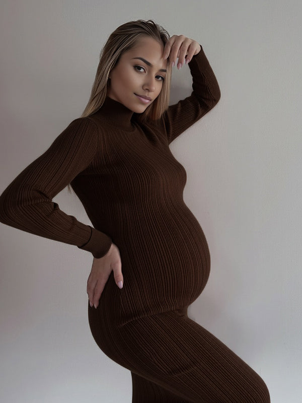 Momyknows Knit Textured High Neck Bodycon Basic Maternity Sweater Maxi Dress