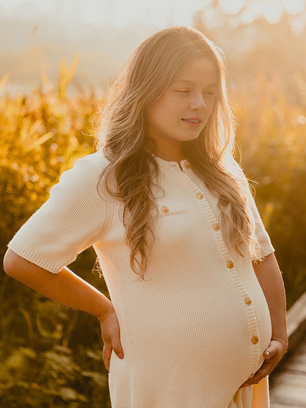 Momyknows White Tache Crochet Pocket Maternity Photoshoot Sweater Mini Dress