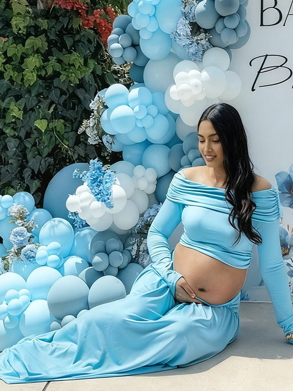 Momyknows Blue Off Shoulder Crop Top Grenadine Maternity Photoshoot Maxi Dress