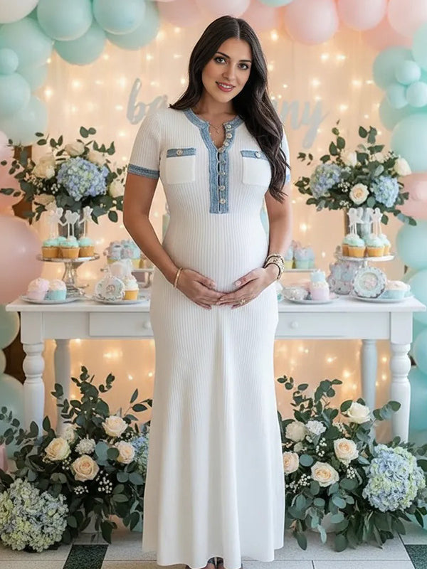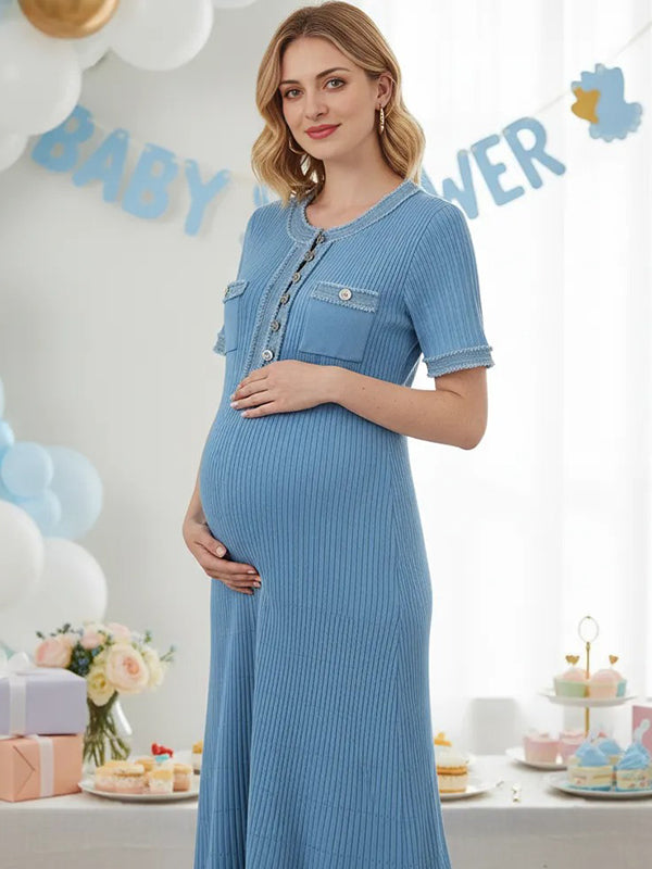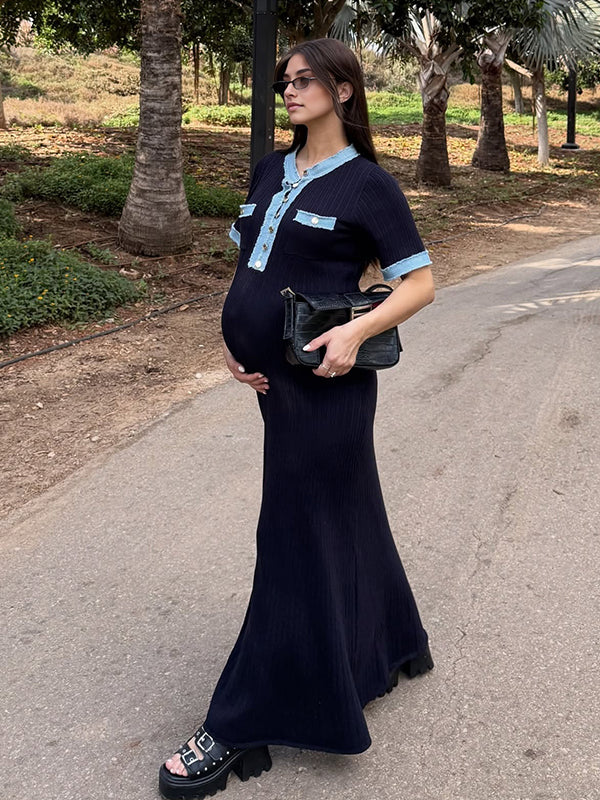 Momyknows Knit Denim Patchwork Ruffle Buttons Pockets Maternity Sweater Maxi Dress
