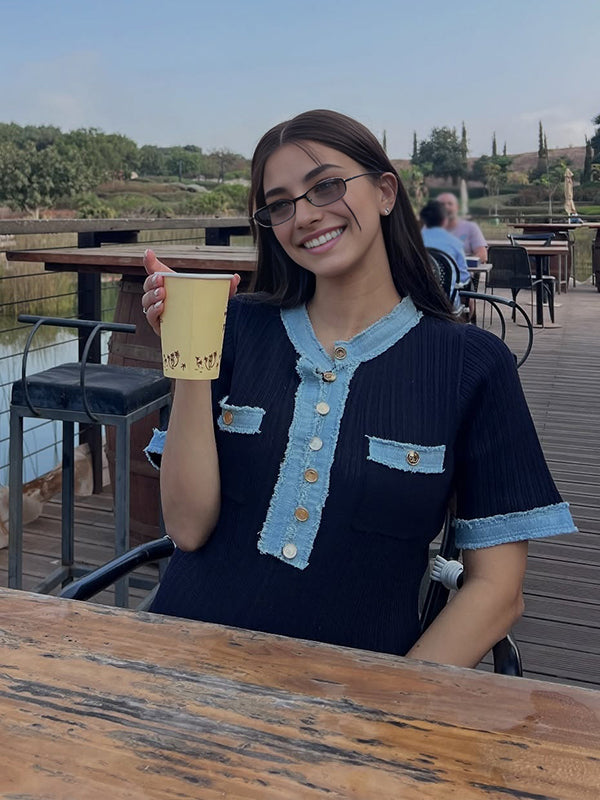 Decoration: Knit, denim, patchwork, ruffle, buttons, pockets, single breasted, bodycon