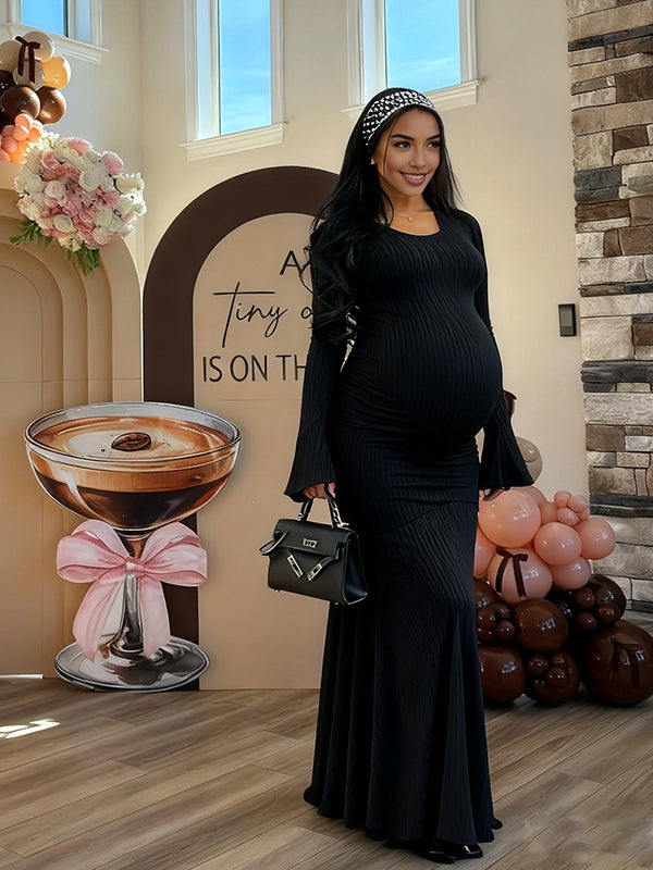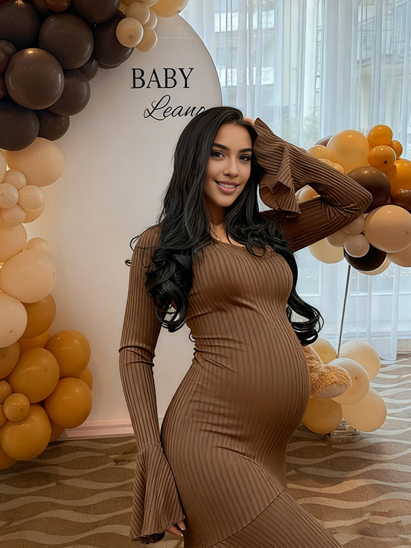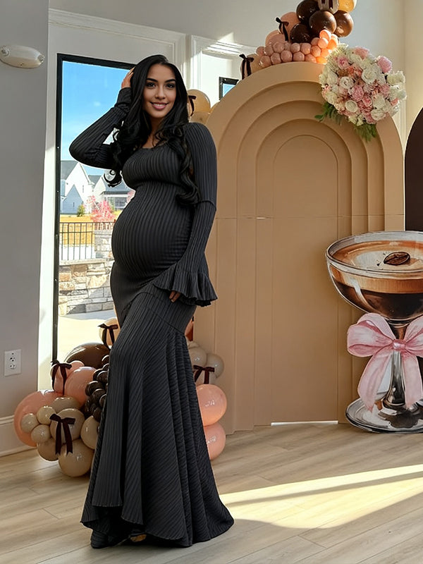 Momyknows Lace-up Striped Flare Sleeve Maternity Baby Shower Maxi Dress
