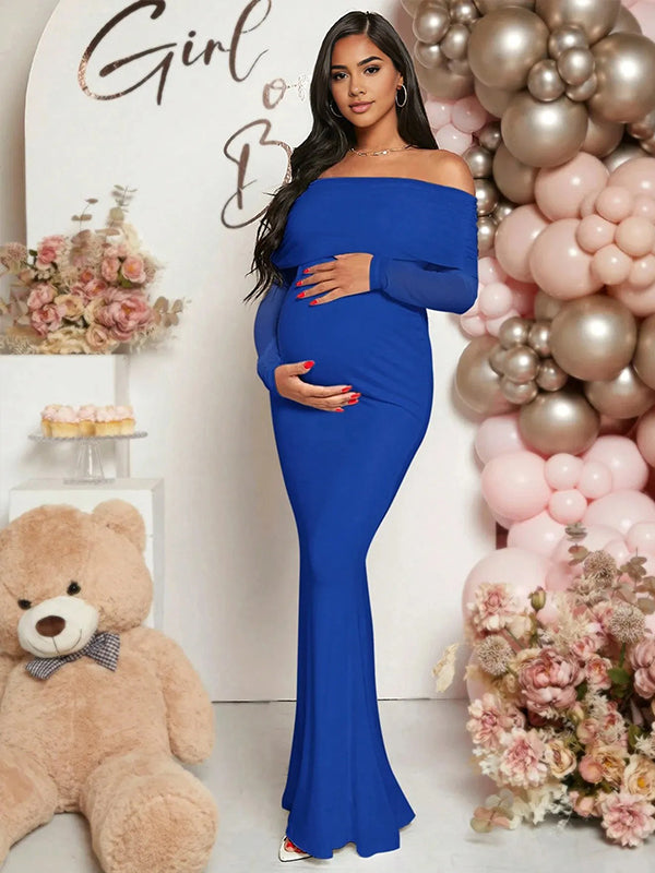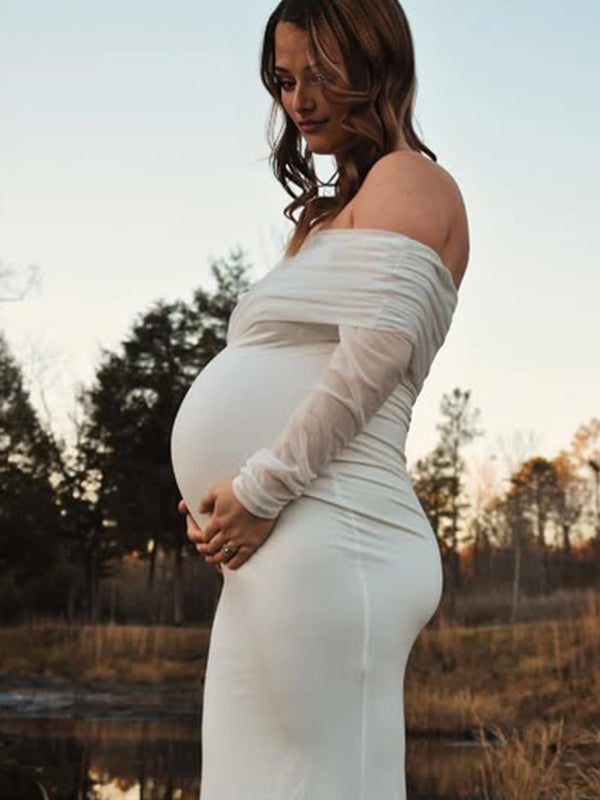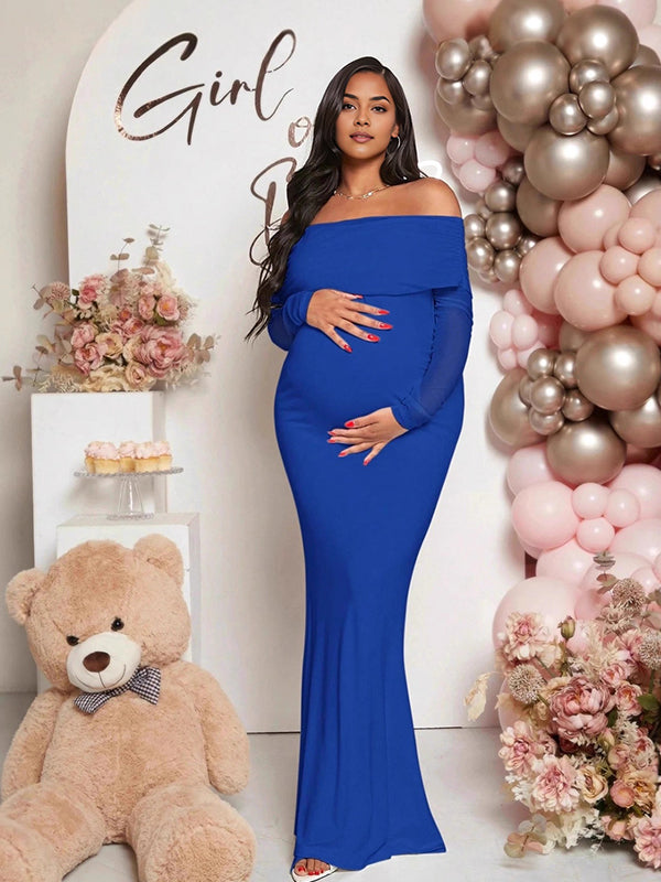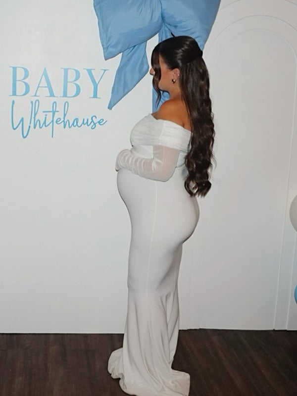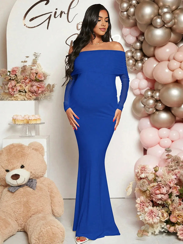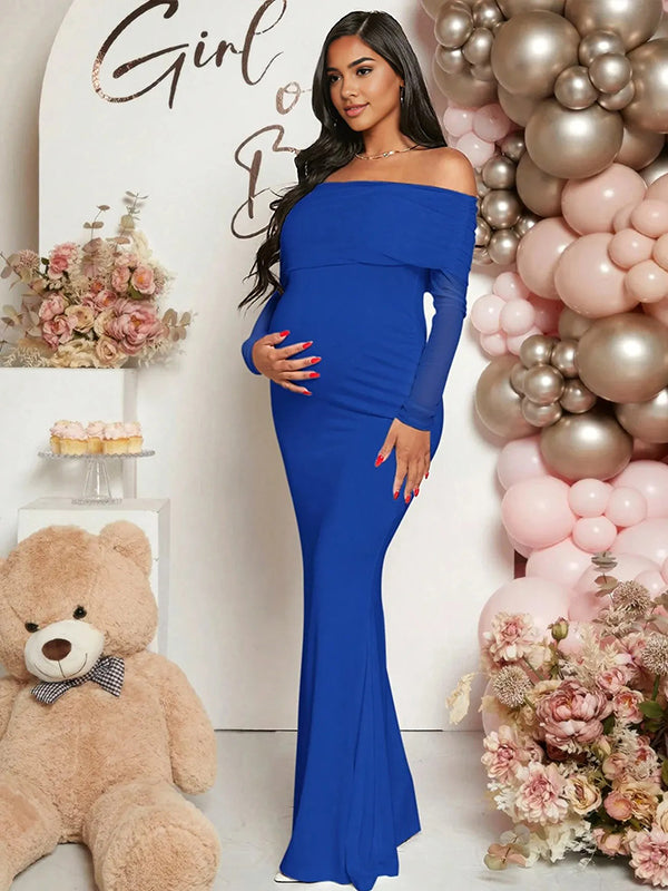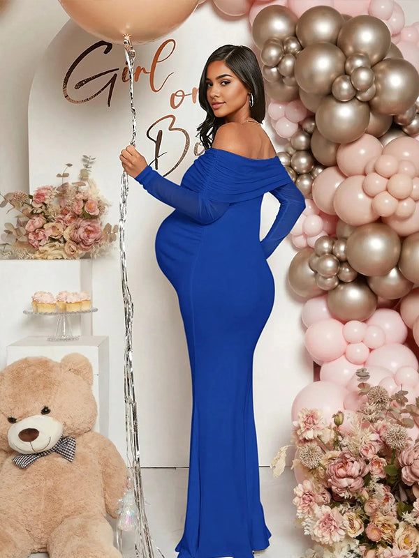 Momyknows Mesh Off Shoulder Ruched Mermaid Elegant Maternity Maxi Dress