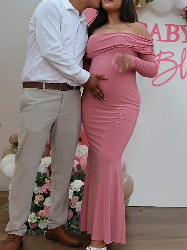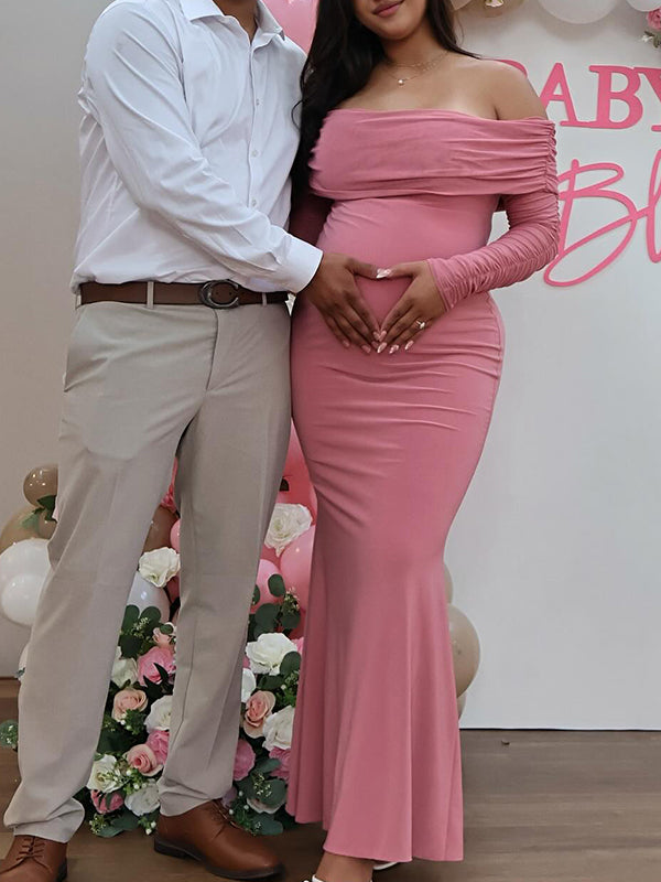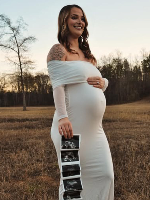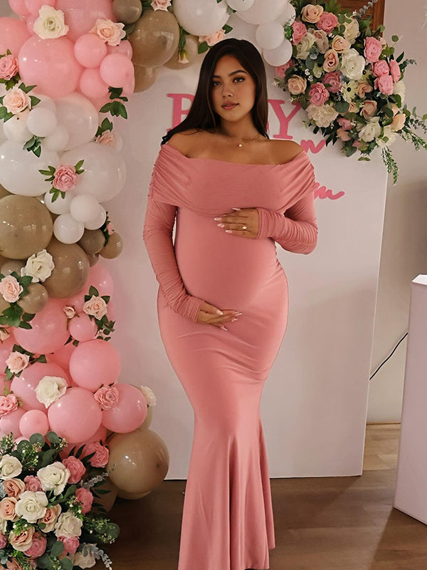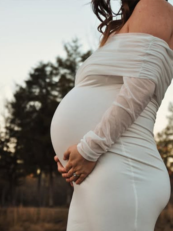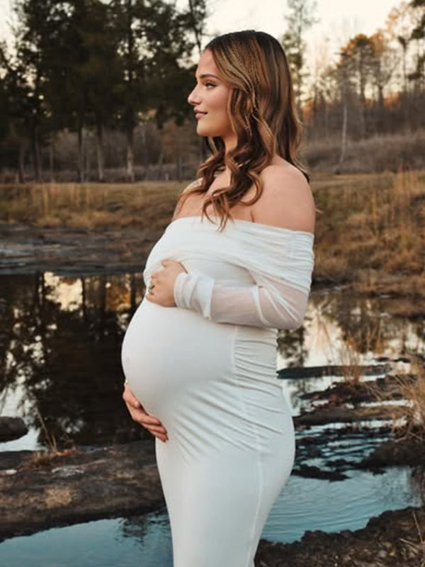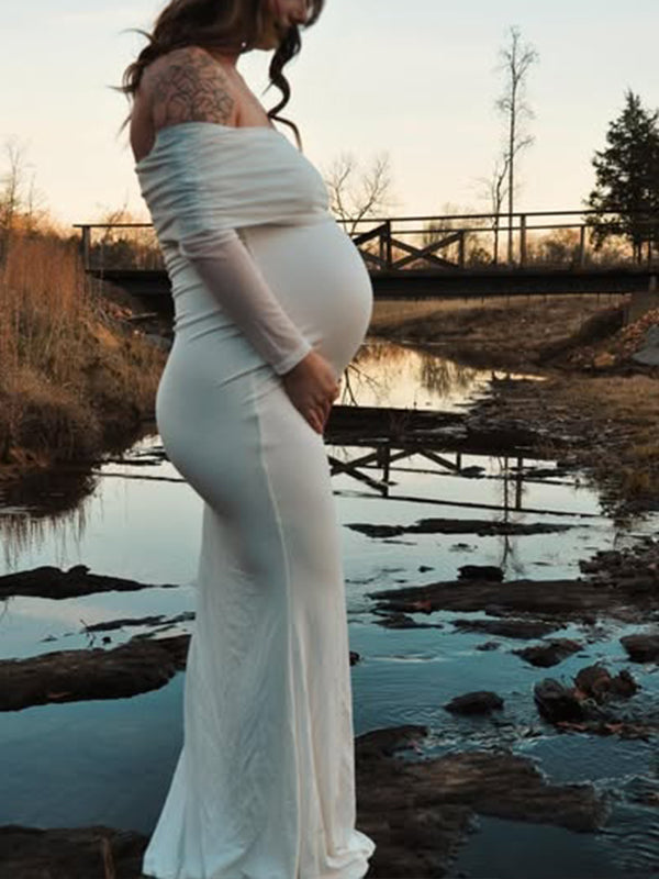 Momyknows Mesh Off Shoulder Ruched Mermaid Elegant Maternity Maxi Dress