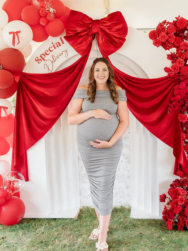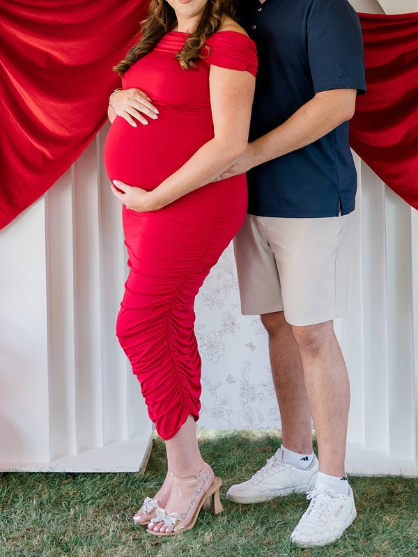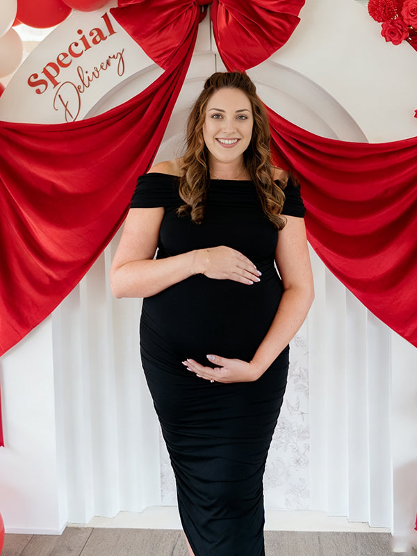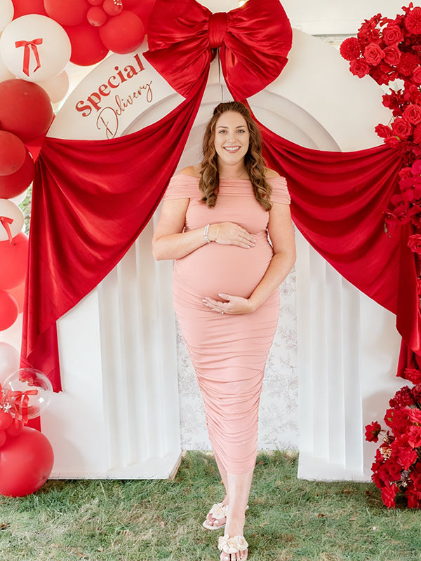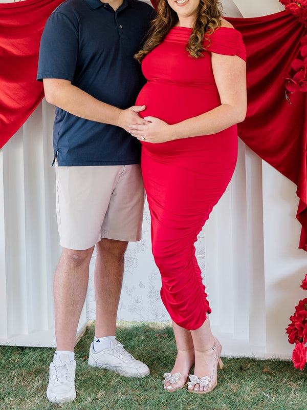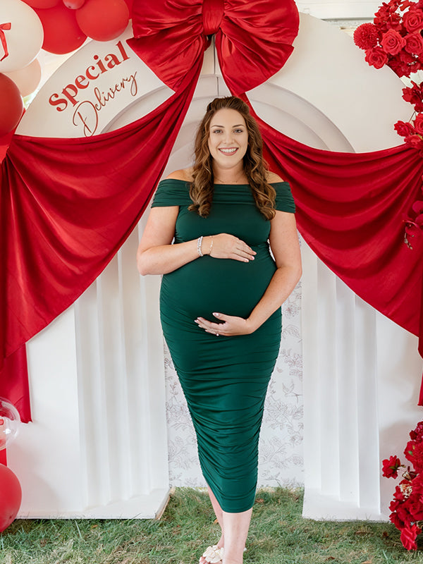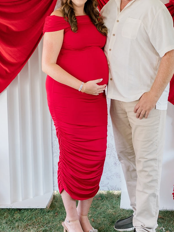 Momyknows Off Shoulder Ruched Side Slit Maternity Baby Shower Maxi Dress
