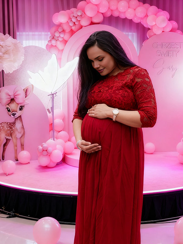 Momyknows Lace Spliced Zipper Ruched Maternity Baby Shower Maxi Dress