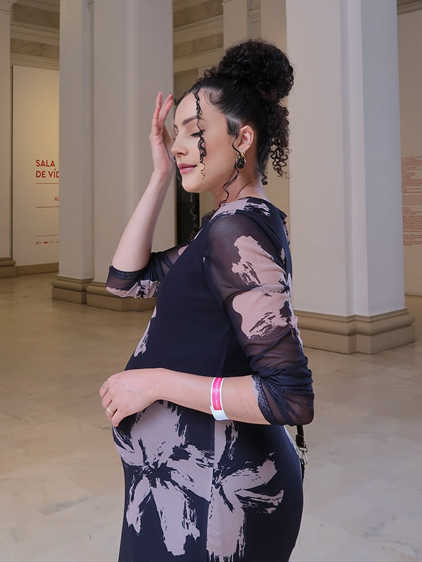 Momyknows Black Print Sheer Maternity Photoshoot Maxi Dress