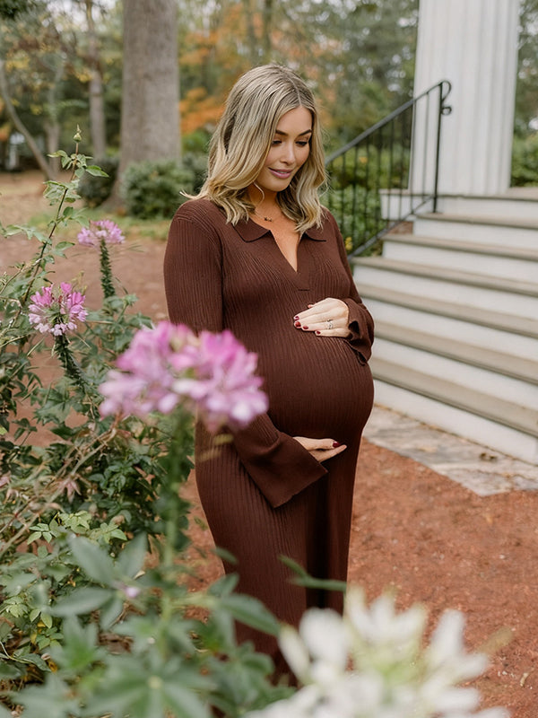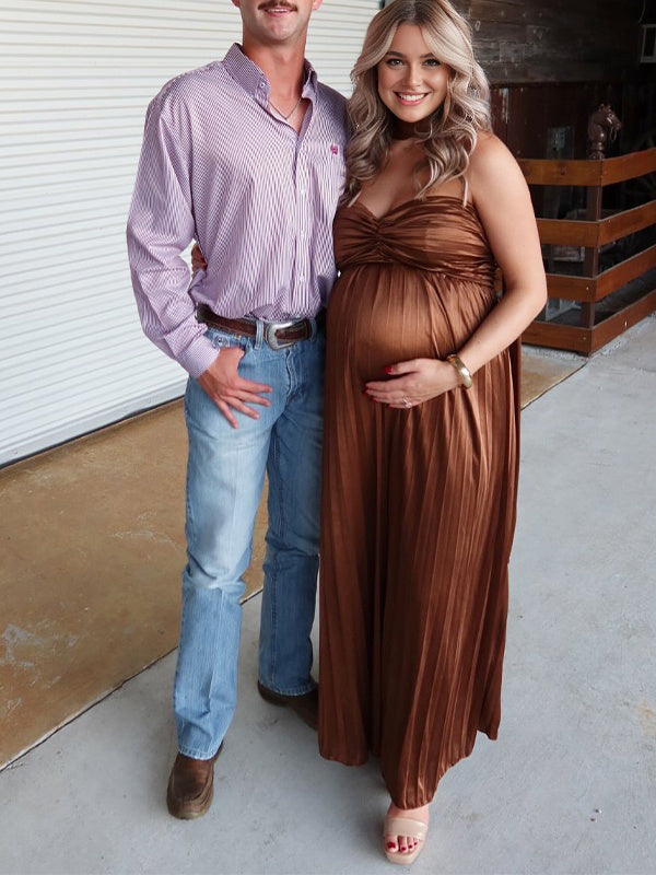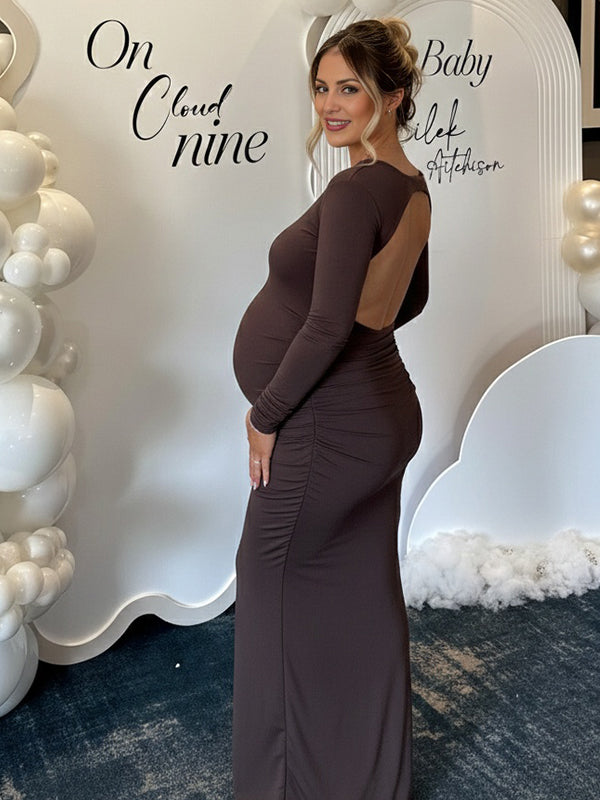 Momyknows Brown Ruched Backless Bodycon Elegant Maternity Maxi Dress