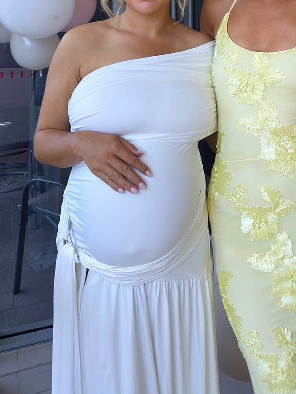 Momyknows White One Shoulder Ruched Metal Buckle Wrap Side Slit Maternity Maxi Dress