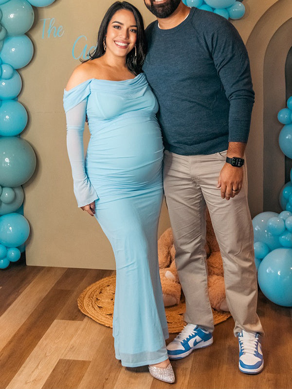 Momyknows Blue Off Shoulder Grenadine Ruched Baby Boy Shower Maternity Maxi Dress
