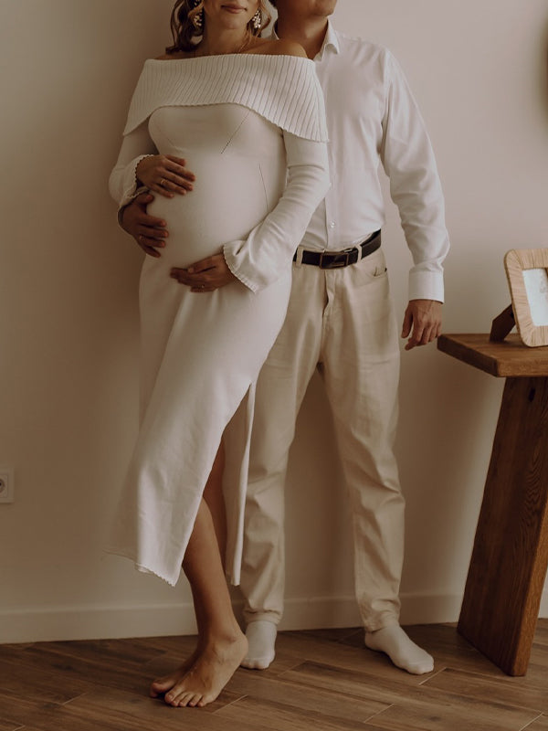 Momyknows White Off Shoulder Side Slit Photoshoot Maternity Maxi Sweater Dress