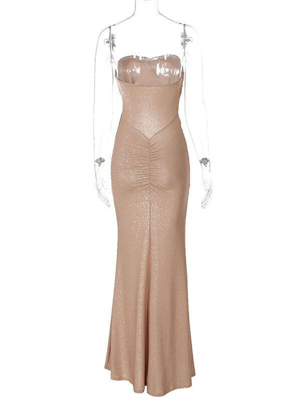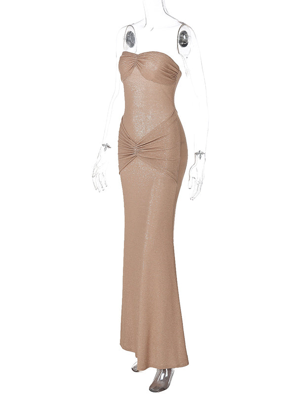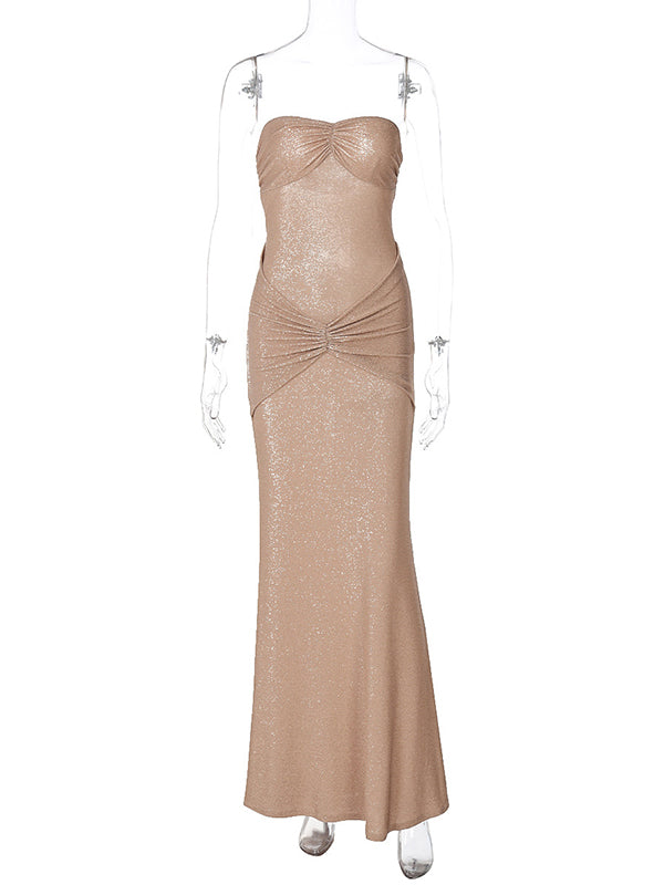 Momyknows Apricot Ruched Sparkly Bandeau Baby Shower Maternity Maxi Dress