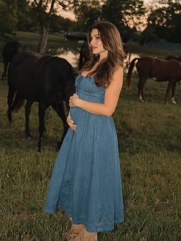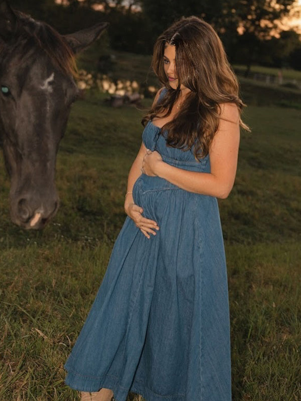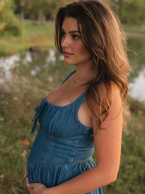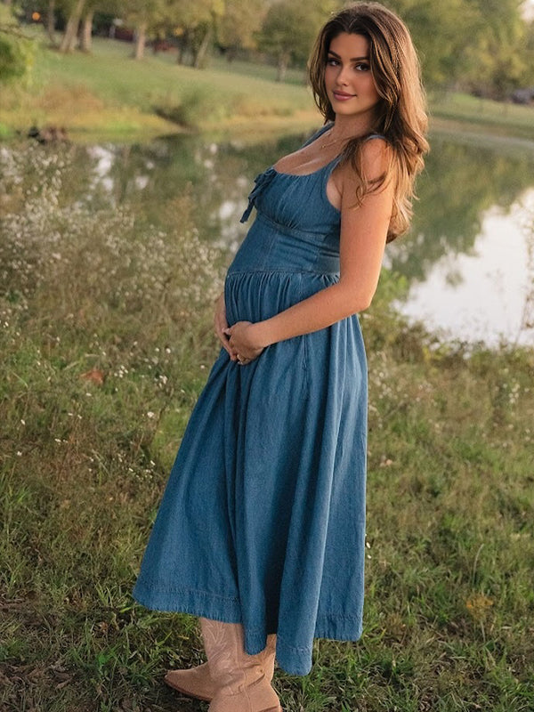 Momyknows Denim Blue Ruched Lace-Up Bodice Big Swing Cami Maternity Maxi Dress