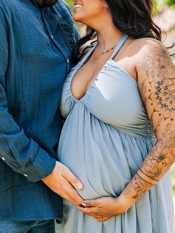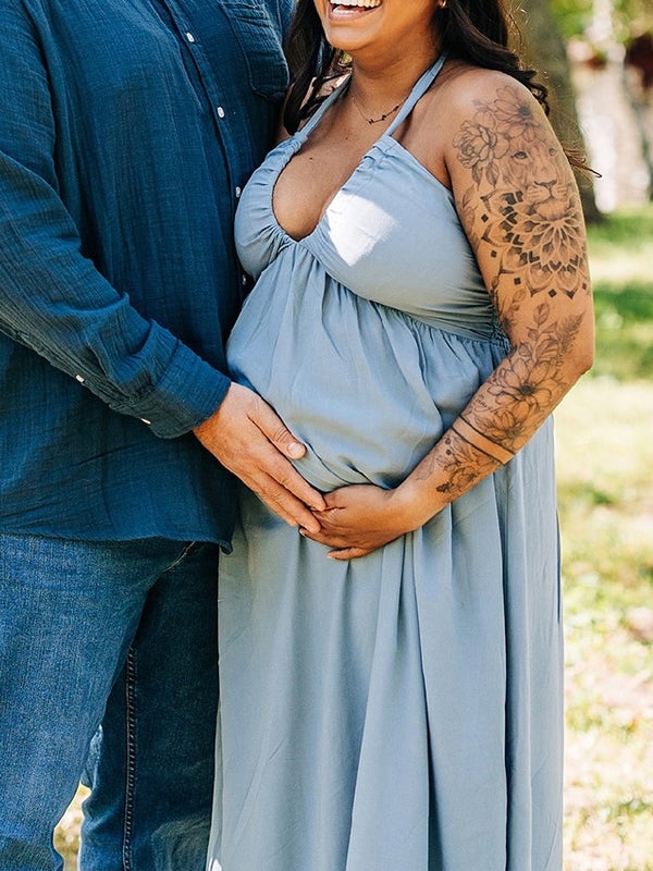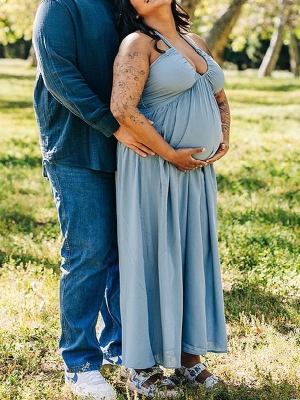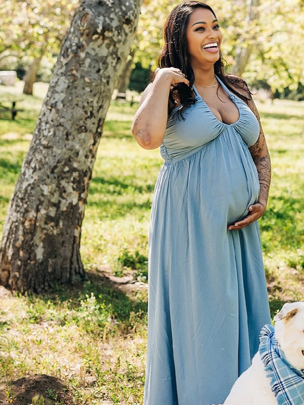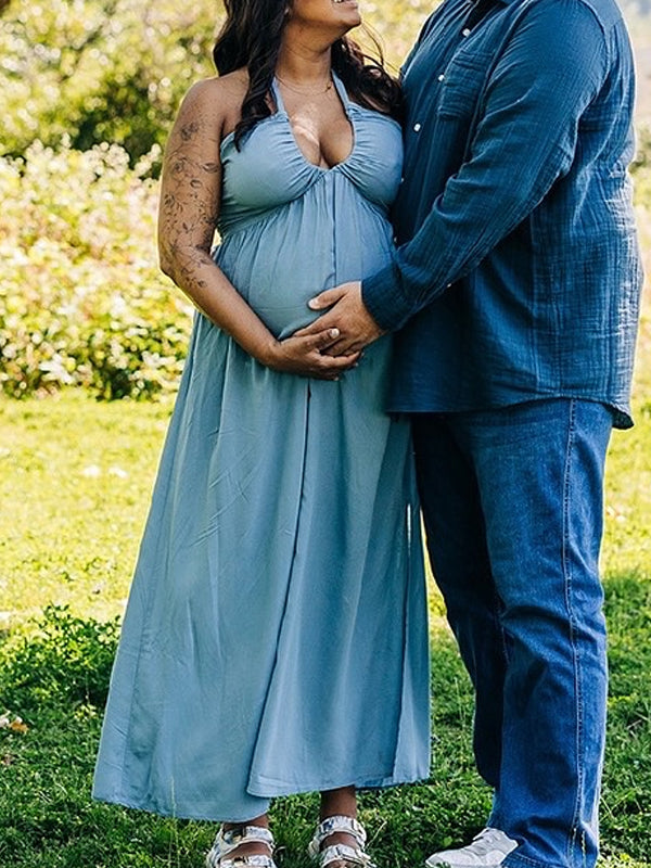 Momyknows Light Blue Deep V Halter Neck Maternity Photoshoot Maxi Dress