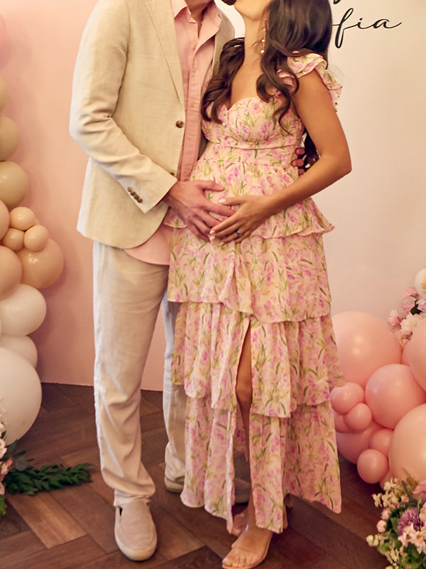 Momyknows Pink Floral Tiered Ruffle Side Slit Big Swing Maternity Maxi Dress