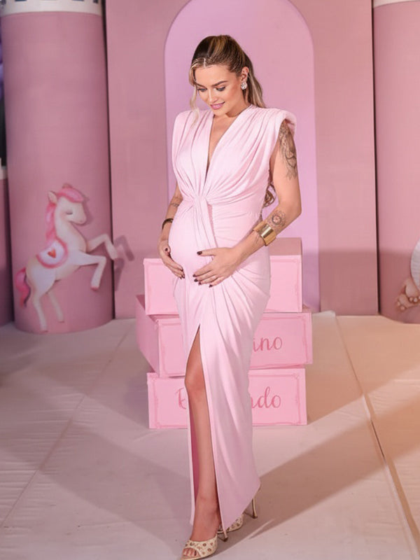 Momyknows Pink Irregular Ruched Draped Slit Shoulder Pads Bodycon Maternity Maxi Dress