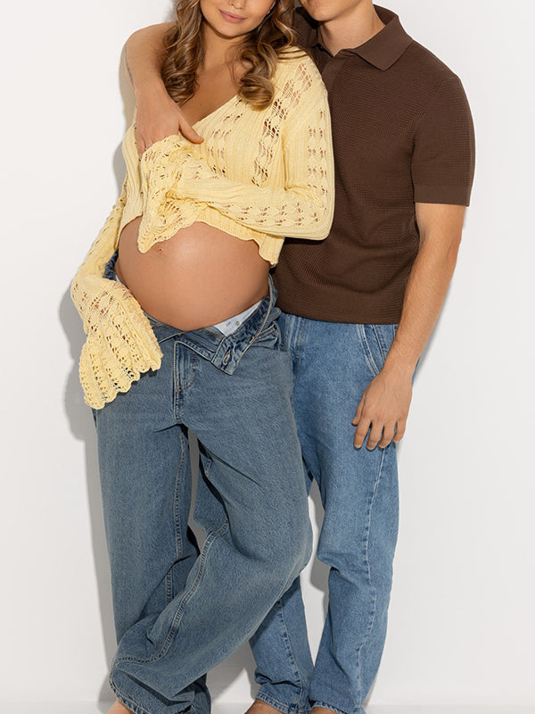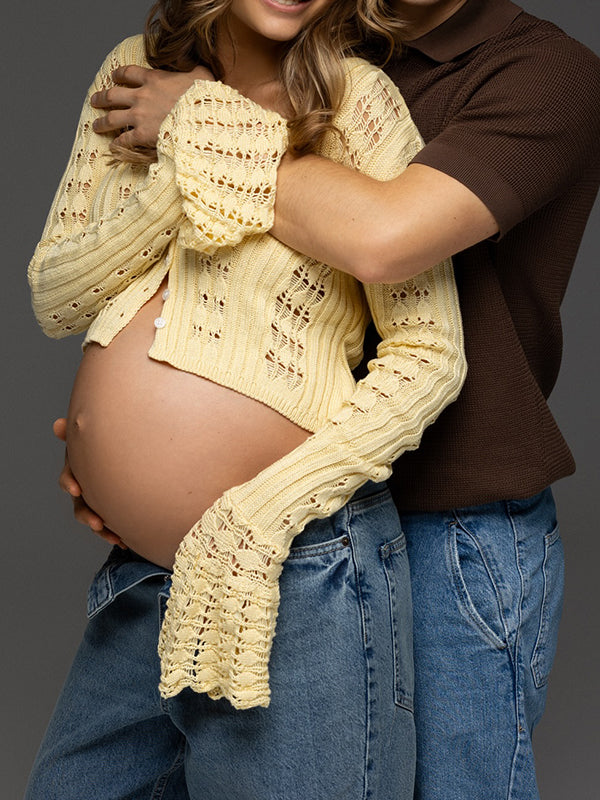 Momyknows Yellow Crochet Hollow Out Single Breasted Ruffle Crop Casual Maternity Cardigan